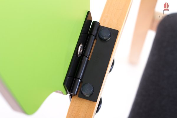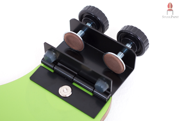 Die Platte ist so belastbar wie robust konstruiert. Die eigentliche Schreibplatte besteht aus an den Ecken und Kanten angenehm abgerundetem Schichtholz. Die farbig gestaltete Oberfläche stellt zugleich einen absolut haltbaren Schutz vor Kratzern oder anderen Beeinträchtigungen dar. Die Platte ist problemlos abwischbar und äußerst strapazierfähig. An der Endseite der Platte ist mittels einer Schraube ein Scharnier aus Metall befestigt. Hieran wiederum schliesst sich ein Metallrahmen an, welcher die beiden Schrauben trägt und den eigentlichen an der Armlehne zu befestigenden Mechanismus bildet. Mittels dieses patentierten Mechanismus lässt sich die Platte nicht nur ganz einfach festdrehen; sie kann auch weggeschoben, in jede beliebige Position verstellt oder hochgeklappt werden.