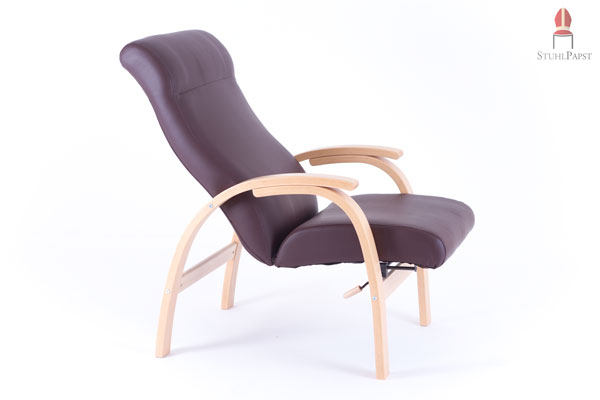 Auffälligstes Kennzeichen des "Exq.uisit Relax" - Sessels ist sicherlich seine luxuriöse Polsterung, mit welcher dieses Sitzmöbel ausgestattet ist. Die Polsterung des Holzstuhls hat eine überaus großzügige und komfortable Dicke, so dass das Sitzen auf ihr zum wahrhaft entspannenden Erlebnis wird. Die Kopflehne selber ist über die luxuriöse Polsterung des Sessels hinaus ebenfalls mit einer speziellen Polsterung versehen. Der "Exq.usit Relax" kann aber nicht allein zum Sitzen genutzt werden. Er ist mit einem speziellen, leichtgängigen und einfach zu bedienenden Mechanismus ausgestattet, mit welchem der Sessel auch in eine Liegeposition verändert werden kann. Seine Position kann also je nach Wunsch angepasst und variiert werden - und damit der Sitzkomfort maximalisiert. Das Polster ist mit einem Bezug aus Kunstleder versehen. Dieses ist nicht nur pflegeleicht; es ist auch hautsympathisch und fühlt sich angenehm an.