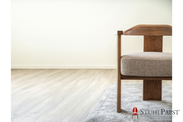 massive Holzgestell verleiht dem Objektstuhl Stabilität und Wertigkeit, während
